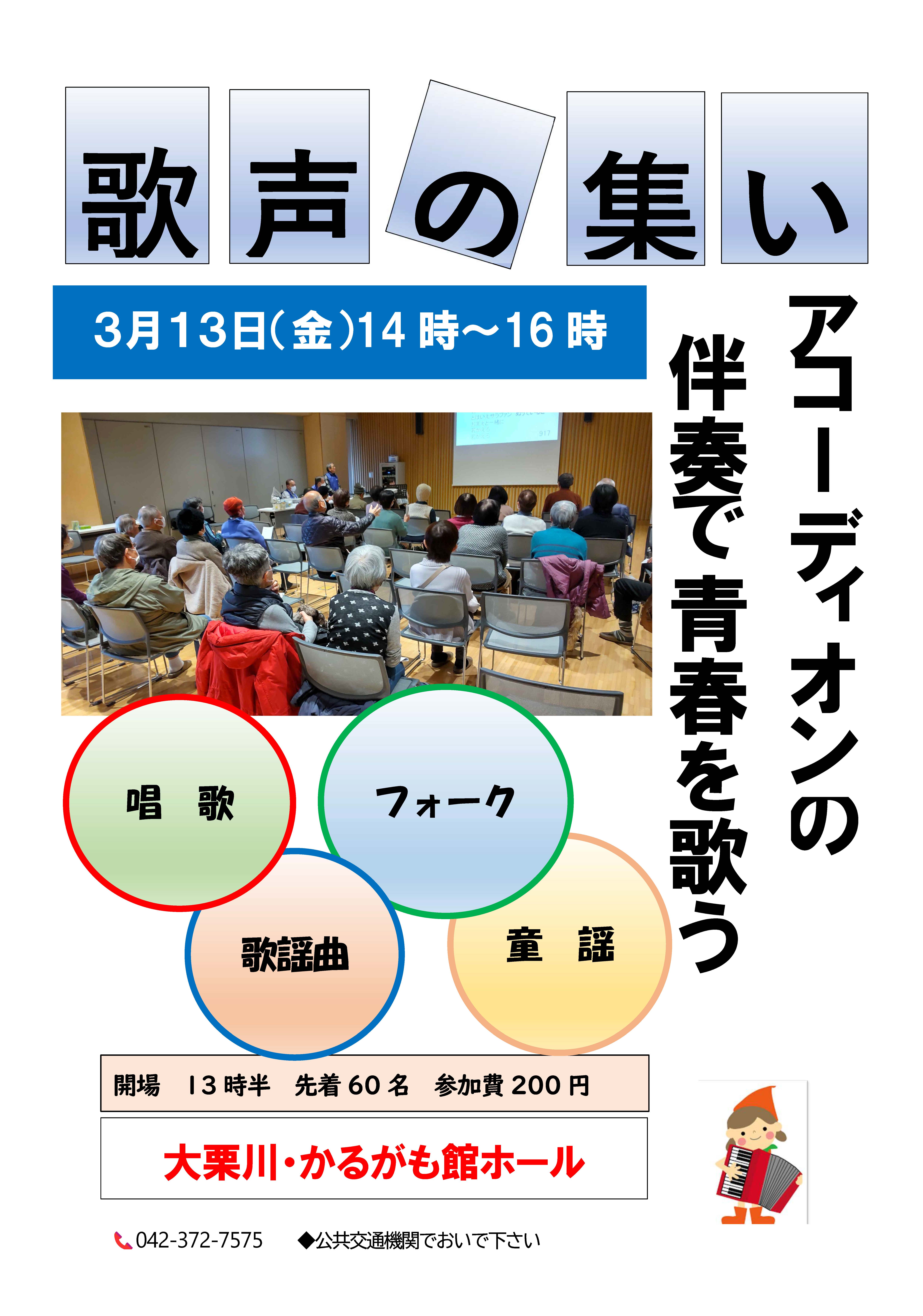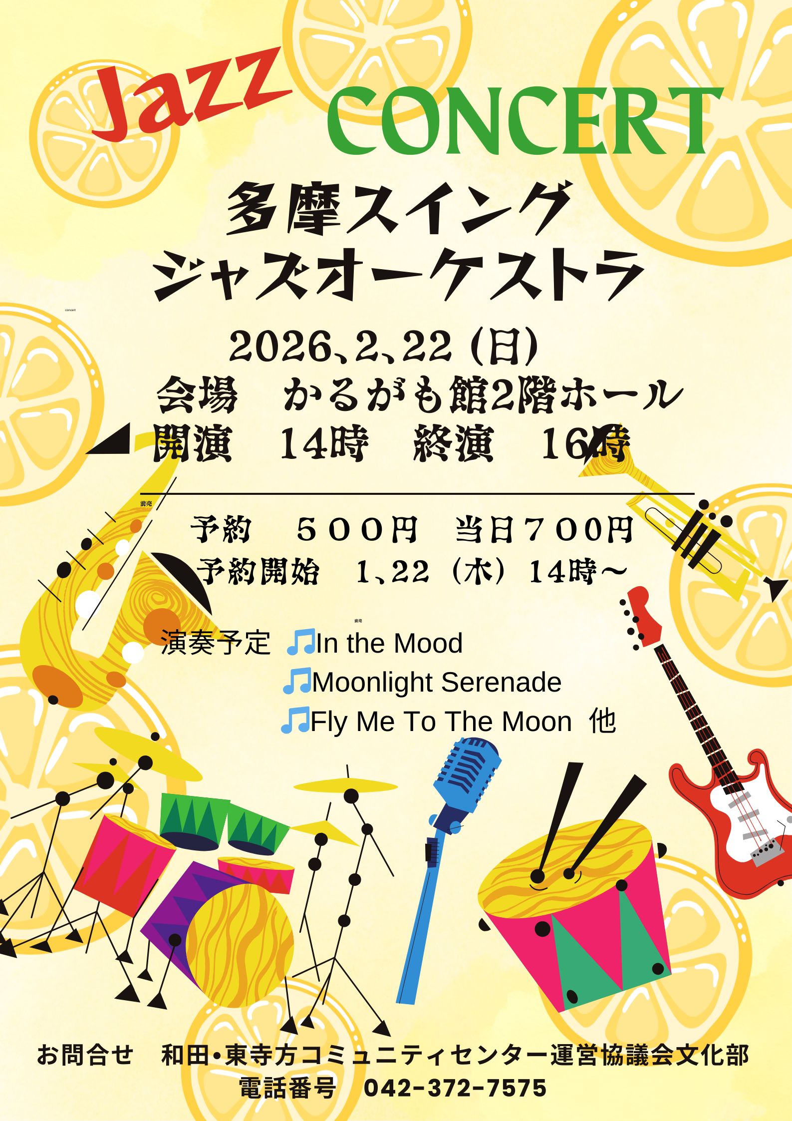 2026年2月 5日:ハートフル💖ウクレレライブ 5日:月例ウォーキング<堀之内沖ノ谷戸公園> 6日:終活サポートセミナー 11日:防災・減災をどうする体験教室 14日:第5回カラオケ発表会 22日:スイングジャズオーケストラのコンサート 4日・18日:初心者大人・こども『将棋教室』